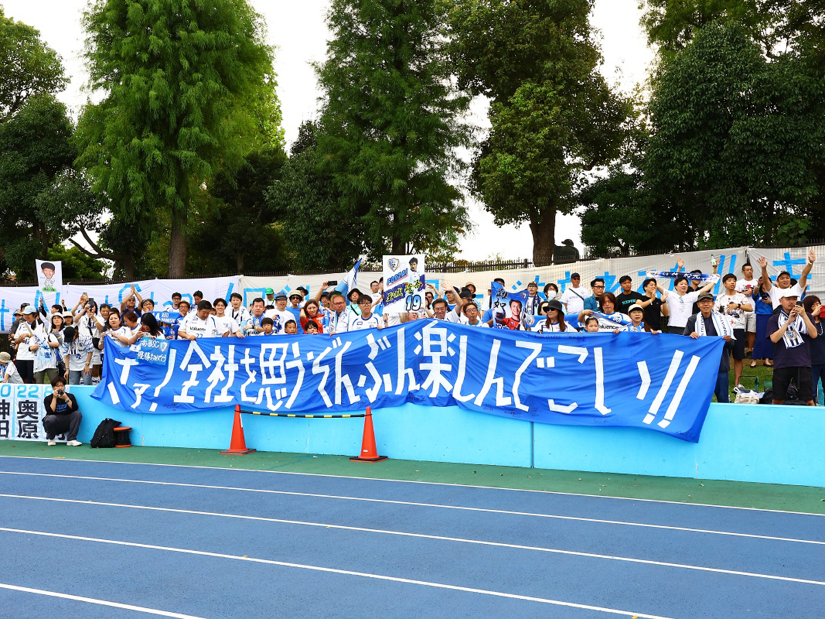 全国社会人サッカー選手権大会に向け横断幕を掲げる南葛SCサポーター