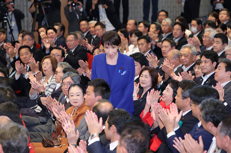 自民党は4日、総裁選の投開票を行い、高市早苗前経済安全保障担当相(中央)を第29代総裁に選出した。決選投票で小泉進次郎農林水産相を下し、自民党初の女性総裁に就任=同日午後、東京・永田町 【時事通信社】