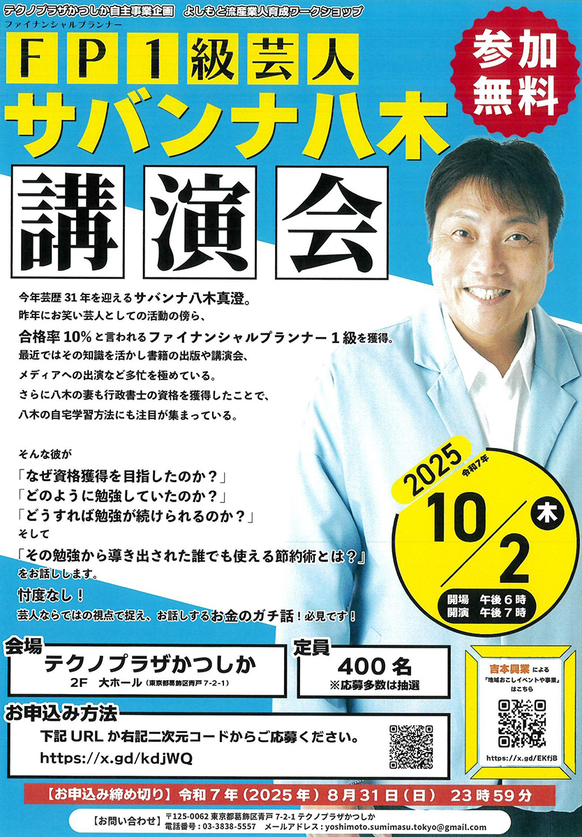 よしもと流産業人育成ワークショップ「FP1級芸人サバンナ八木講演会」が10月2日、テクノプラザかつしか(葛飾区青戸7)で行われた。