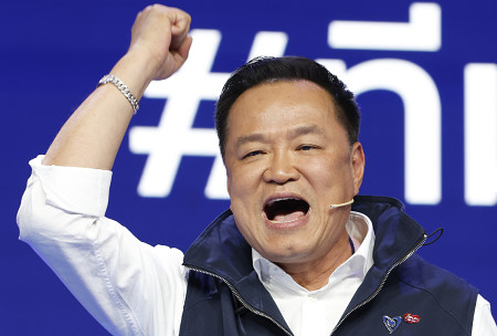 タイで8日、下院(定数500)総選挙の投開票が実施される。写真はアヌティン首相=6日、バンコク 【EPA時事】