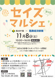 住宅の設計・建築・販売とローカルニュースメディア「葛飾経済新聞」の運営を手がける「セイズ」(葛飾区立石7)が11月8日、地域活性イベント「第5回セイズマルシェ~セイズ×葛飾経済新聞」を葛飾・立石で開催する。