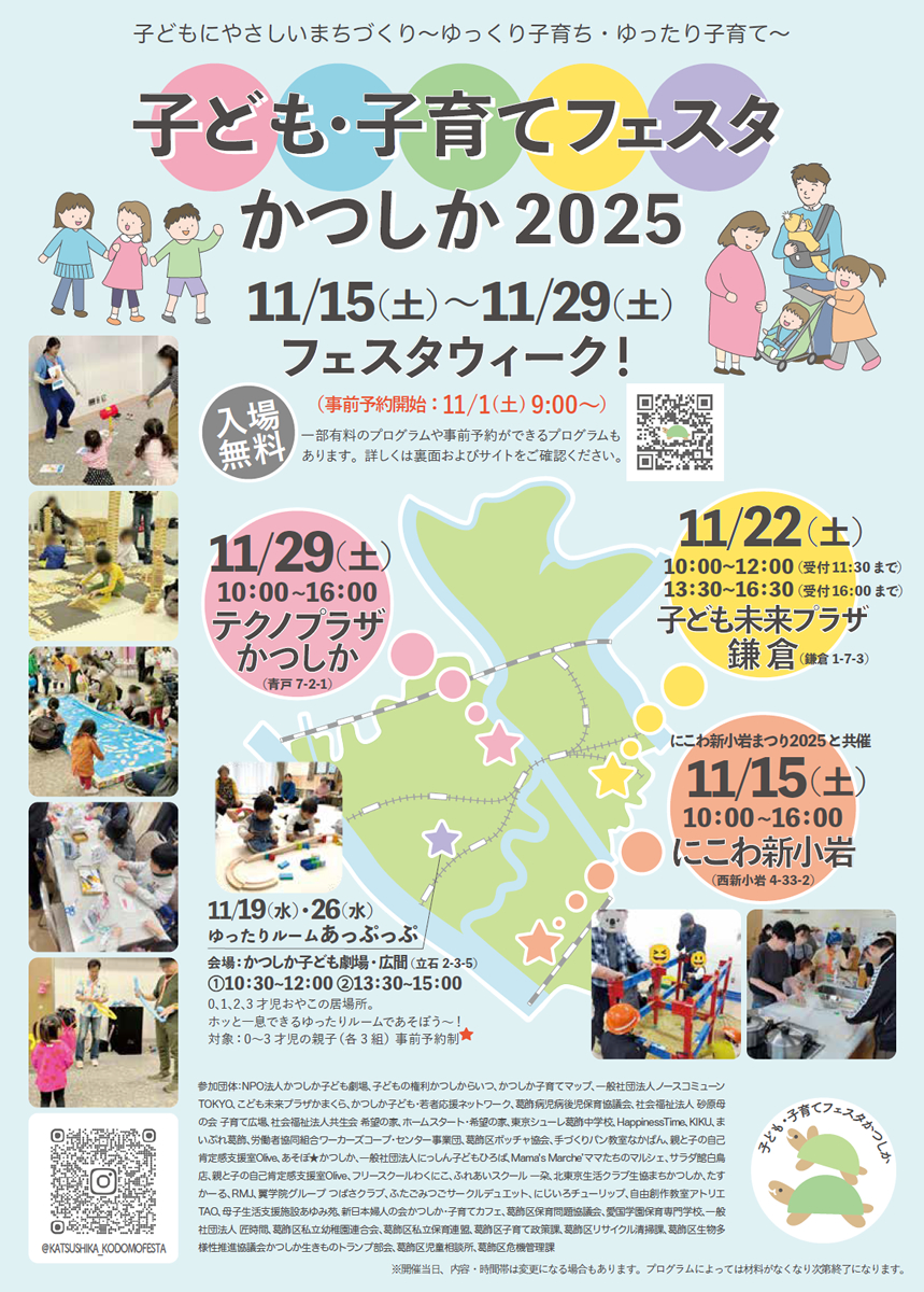 「子育て中の家庭に、子どもや子育てに関する活動をしている団体を知ってもらう機会を作りたい」という思いで、「かつしか子育てネットワーク」が企画した同イベント。「子どもに優しいまちづくり~ゆっくり小育ち・ゆったり子育て」をキャッチコピーに、各団体の代表者が中心となり企画・運営に取り組む。