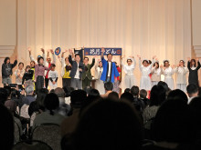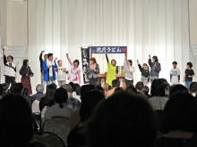 葛飾区の産業振興と世代間交流を目的に、2016(平成28)年に始まった同公演。10回目の節目を迎えた今回のタイトルは、「あの日の笑顔を取り戻せ 消えたビデオを追いかけて」。余命わずかな祖母のために、古いビデオに記録されていた葛飾区青戸の祭りを現代で再現しようと、葛飾区民が一致団結するストーリー。本格的な漫才、懐かしのコントや歌、子どもたちによるペンライトを使ったダンスなど、バラエティー豊かな構成で会場を沸かせた。