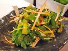 店の「名物」として多くの常連客から愛される「ゴニラ」(500円)は、誉之さんの父である2代目・泰典さんが30年以上前に考案した韓国風のニラのおひたし。「当初は、もっと辛めの味付けだった」が、それを初めて食べた女性客が「辛さに驚いて、まるでゴジラのように顔をしかめた」ことから、泰典さんが思いついたネーミングだという。