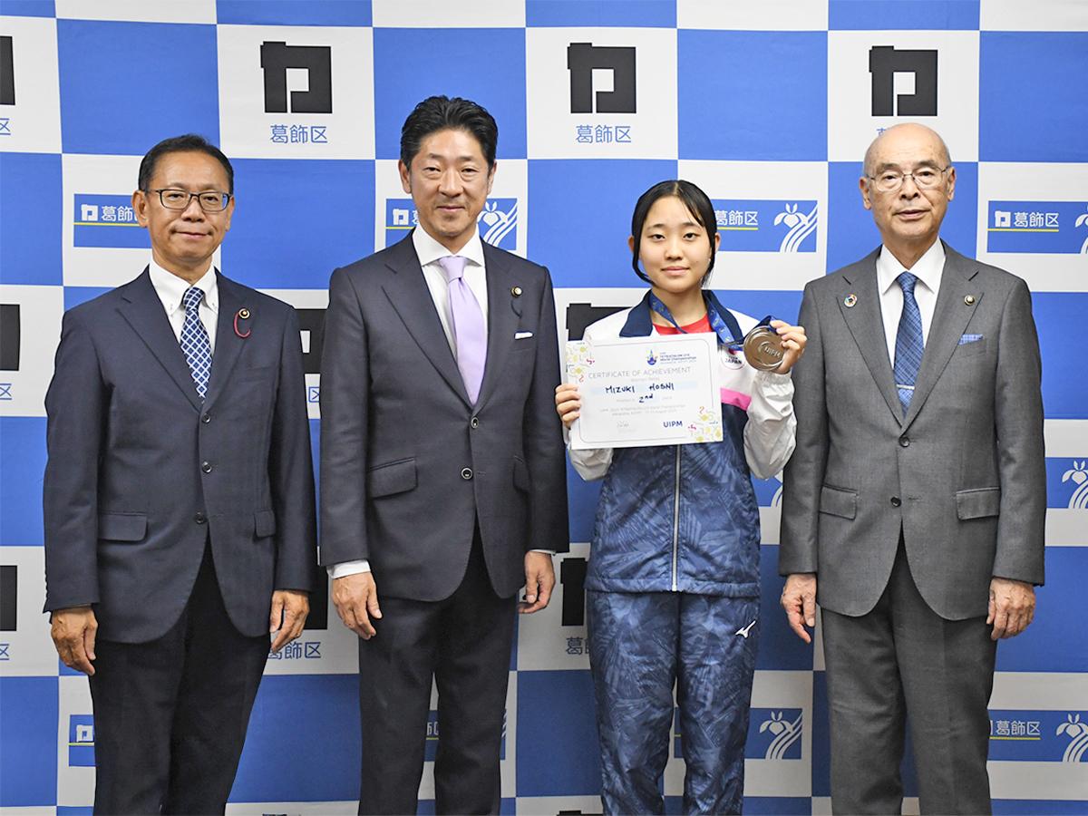 葛飾区在住で近代五種競技の星瑞葵(みずき)選手が10月16日、青木克徳葛飾区長を表敬訪問し、「近代五種U15世界選手権」で銀メダルを獲得したことを報告した。