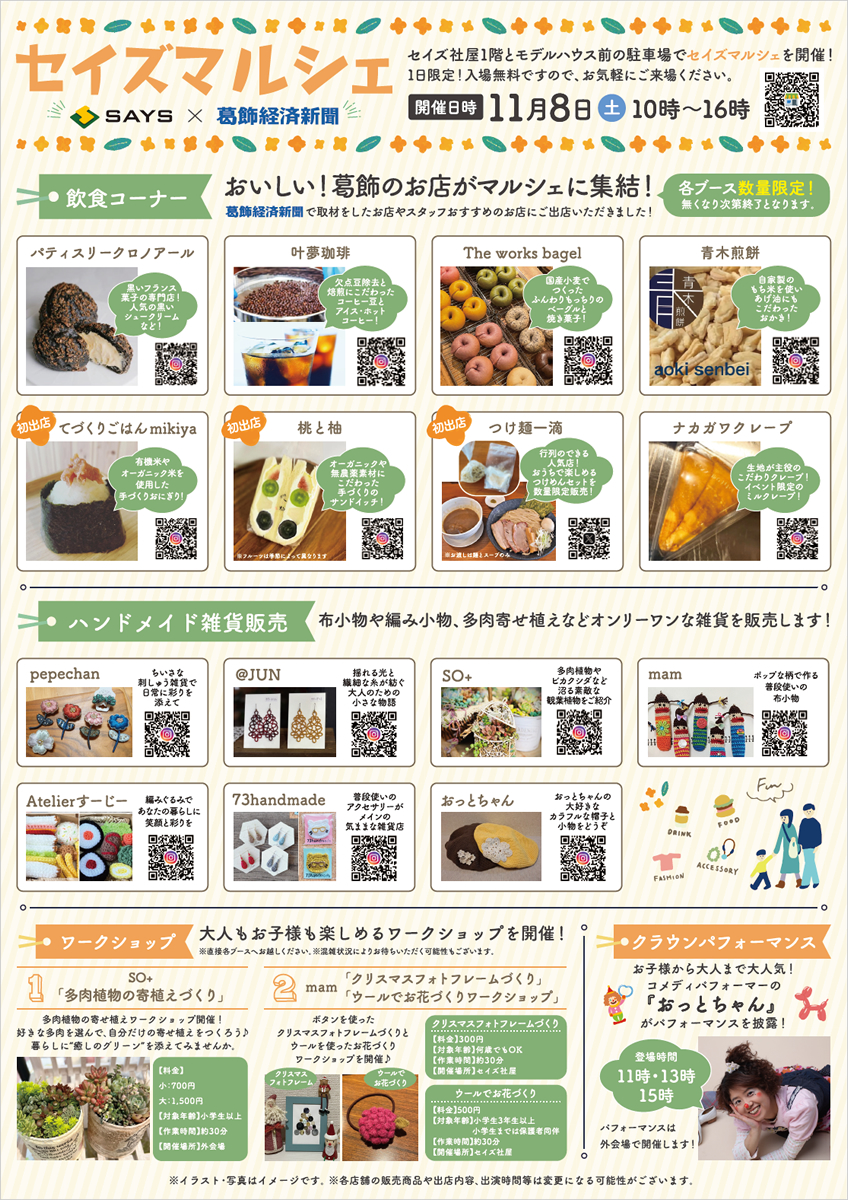住宅の設計・建築・販売とローカルニュースメディア「葛飾経済新聞」の運営を手がける「セイズ」(葛飾区立石7)が11月8日、地域活性イベント「第5回セイズマルシェ~セイズ×葛飾経済新聞」を葛飾・立石で開催する。