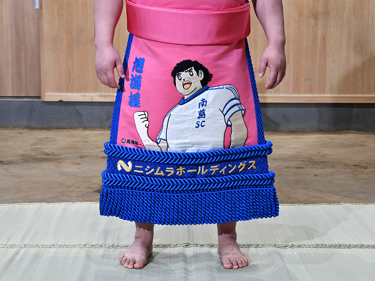 大島部屋(葛飾区青戸7)で1月7日、同部屋の力士・旭海雄(きょくかいゆう)関の十両昇進を記念し、人気漫画「キャプテン翼」の主人公・大空翼をモチーフとした「大空翼デザイン化粧まわし」がお披露目された。